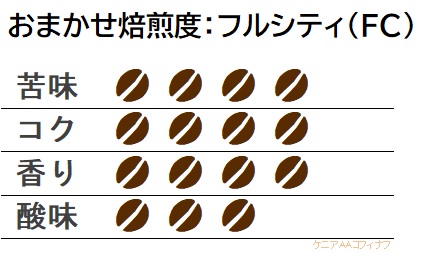 深煎りでもケニアらしい柑橘系の風味があり、芳醇な香りと甘味が感じられます。