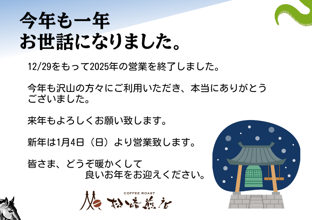 2025年もお世話になりました。 お知らせ 2025.12.31 この1年も多くの皆さまにご利用いただき有難うございました。2026年も皆様に香り高い新鮮なコーヒーをお楽しみいただければ幸いです。何卒よろしくお願い致します。
